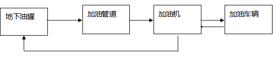 加油工藝:加油作業時,采用潛油泵提供的動力,油品通過加油管道至加油機,進入受油容器。同時,加汽油作業時,有油氣回收回收系統,汽油蒸汽通過油氣回收管道回至汽油罐。具體流程見下圖: